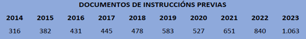 Dos 5.716 documentos notariais de Instrucións Previas tramitados nos 10 últimos anos, 2.554 rexistráronse nese trienio, un 44,7% do total, con aumentos sucesivos do 26,5% en 2021, 29% en 2022 e, a falta de computar os subscritos en decembro pasado, 23,5% en 2023. Ademais, nos dous últimos anos, a solicitude de eutanasia incluíuse no 63% e o 79% dos DIP, respectivamente.