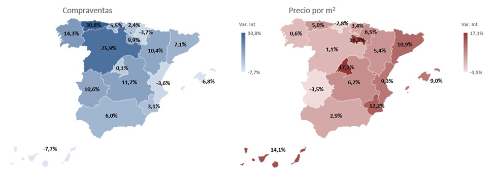 Los precios aumentaron en 15 comunidades autónomas, con incrementos destacados en Madrid (17,1%), La Rioja (16,3%), Canarias (14,1%), Murcia (12,2%), Cataluña (10,9%), Comunidad Valenciana (9,3%) y Baleares (9,0%). Por debajo de la media se situaron Navarra (6,5%), Castilla-La Mancha (6,2%), Aragón (5,4%), Asturias (5,0%), País Vasco (3,4%), Andalucía (2,9%), Castilla y León (1,1%) y Galicia (0,6%). Y disminuyeron en Extremadura (-3,5%) y Cantabria (-2,8%).