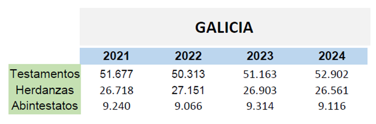 Aunque en tener absolutos Galicia es la quinta comunidad autónoma en número total de testamentos firmados cada año, tradicionalmente es en la que se otorga la mayor tasa conforme su población. En 2024, se registraron en las notarías gallegas 195 por cada 10.000 habitantes, seguida la grande distancia por Asturias, con 181, y País Vasco, con 178.