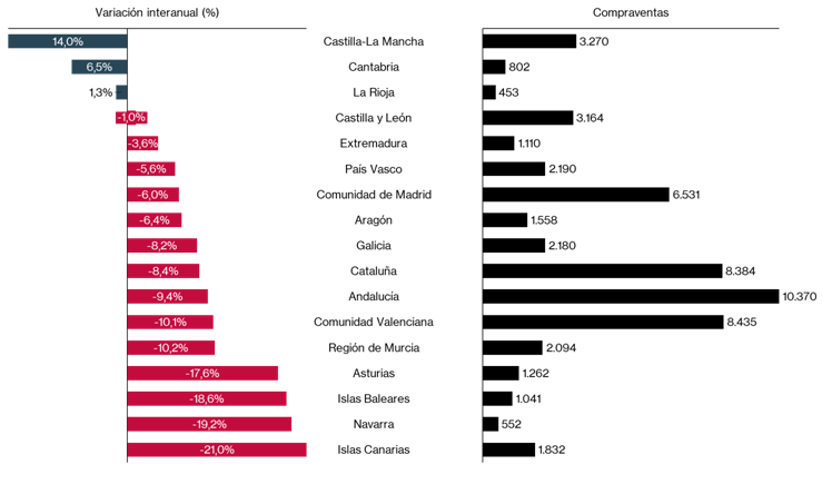 En el recuento territorial, la compraventa cayó en 14 comunidades y se incrementó en tres. Destacan los descensos Canarias (-21,0%), Navarra (-19,2%), Islas Baleares (-18,6%) y Asturias (-17,6%) en contraste con el aumento de operaciones en Castilla-La Mancha (14,0%), Cantabria (6,5%) y La Rioja (1,3%).