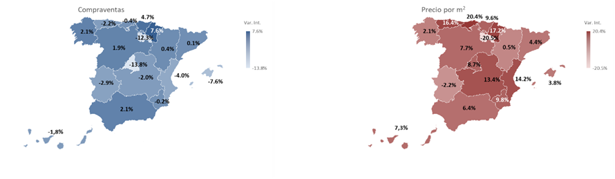 Por territorios, a compravenda de vivenda reduciuse en 10 comunidades autónomas e creceu en sete. Destacan os aumentos en Navarra (7,6%), País Vasco (4,7%), Galicia (2,1%), Andalucía (2,1%) e Castela e León (1,9%) e os descensos en Madrid (-13,8%), A Rioxa (-12,3%), Baleares (-7,6%) e Comunidade Valenciana (-4,0%).