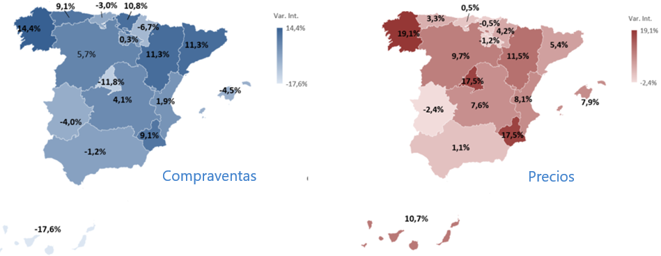 La compraventa de vivienda creció en diez comunidades autónomas: Galicia (14,4%), Cataluña (11,3%), Aragón (11,3%), País Vasco (10,8%), Asturias (9,1%), Murcia (9,1%), Castilla y León (5,7%), Castilla-La Mancha (4,1%) Comunidad Valenciana (1,9%) y La Rioja (0,3%). Y se redujo en siete: Canarias (-17,6%), Madrid (-11,8%), Navarra (-6,7%), Baleares (-4,5%), Extremadura (-4,0%), Cantabria (-3,0%) y Andalucía (-1,2%).